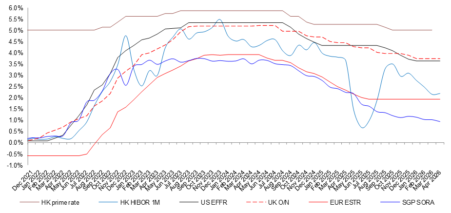 图表:日均利率走势:HIBOR、SORA同比下行显著,可能由于避险资金涌入