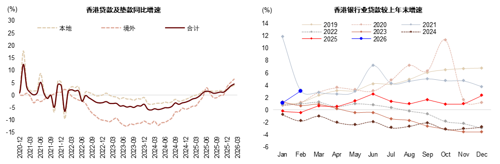 多重不确定性下预计1Q26资产减值损失同比可能有较大幅度上行。风险点主要包括:1)中东地缘政治冲突,部分上市银行公开表示可能因宏观假设变动额外计提拨备,但针对敞口集中计提减值损失可能为时尚早;2)香港本地银行地产敞口集中度仍然较高,部分银行可能存在潜在计提压力。2026年初以来香港商业地产呈现复苏态势,但我们仍认为判断反转可能为时尚早。