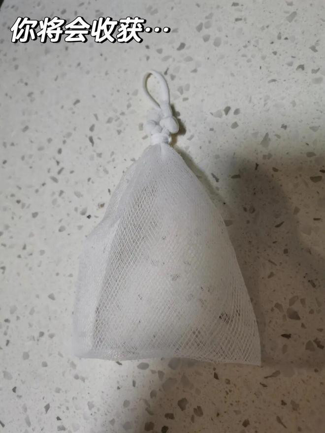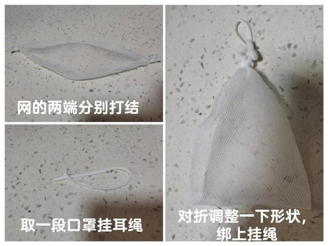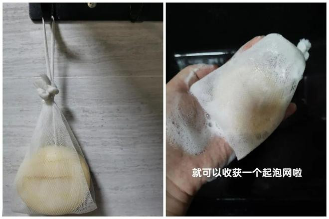 平时买大蒜送的网袋,两端打个结对折一下,取一段口罩挂耳绳绑上去,就是一个天然的肥皂起泡网了。