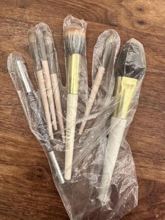 每次出门带化妆刷,不是被压变形就是炸毛乱飞,想买个化妆刷包?别浪费了,一次性手套就是最好用的收纳工具。