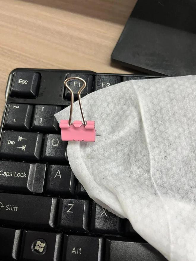 如果键帽上有顽固污渍,就用酒精湿巾擦一擦,也可以搭配长尾夹的手柄对键盘进行深度清洁。