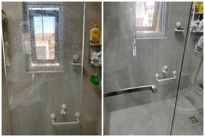 就拿淋浴区玻璃门来说,只需要在喷壶里装点醋和洗洁精,喷洒到玻璃门上,再套上搓澡巾去擦,干净又轻松,根本就不用买清洁剂。