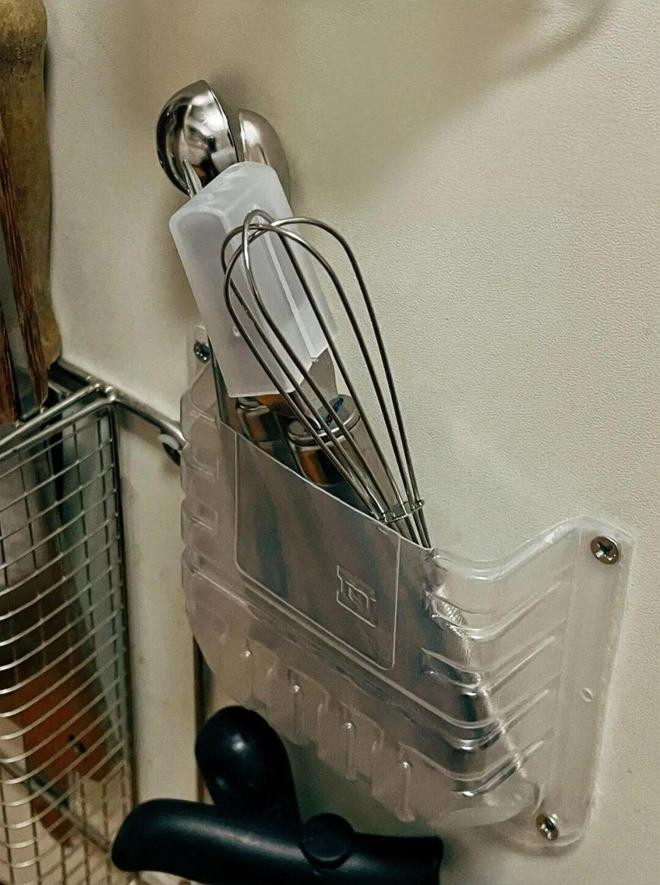 超市生鲜食品用的塑料托盘,先别急着扔,将它对半剪开,用纳米胶或螺丝安装在橱柜门背面,一个壁挂收纳盒就有了。