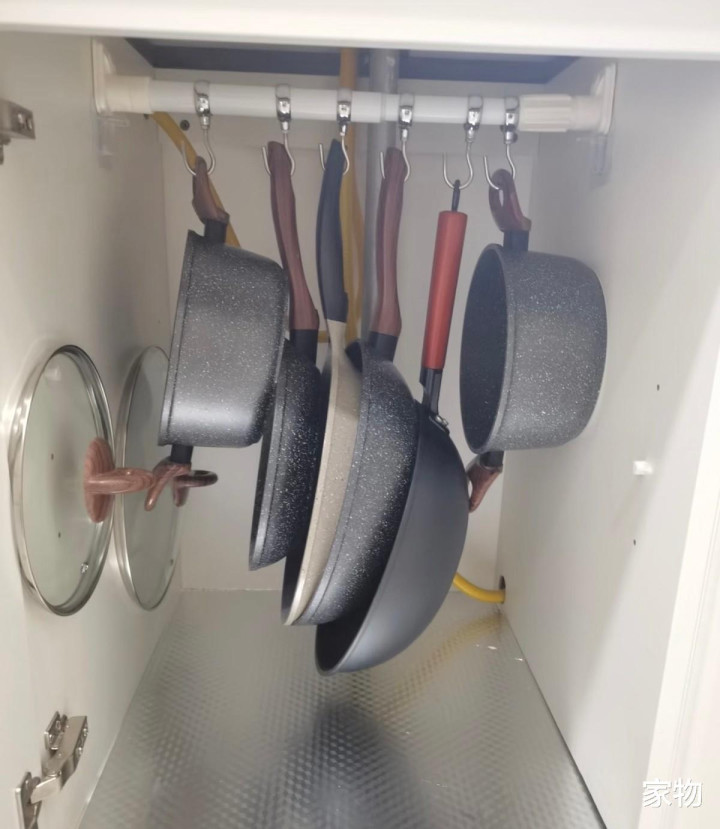 装修前若是能考虑周全,可以留一个柜子做锅具拉篮,若当时没有做,也可以清除柜板,加一个挂杆挂置锅具,收纳一目了然,拿取也更加方便。