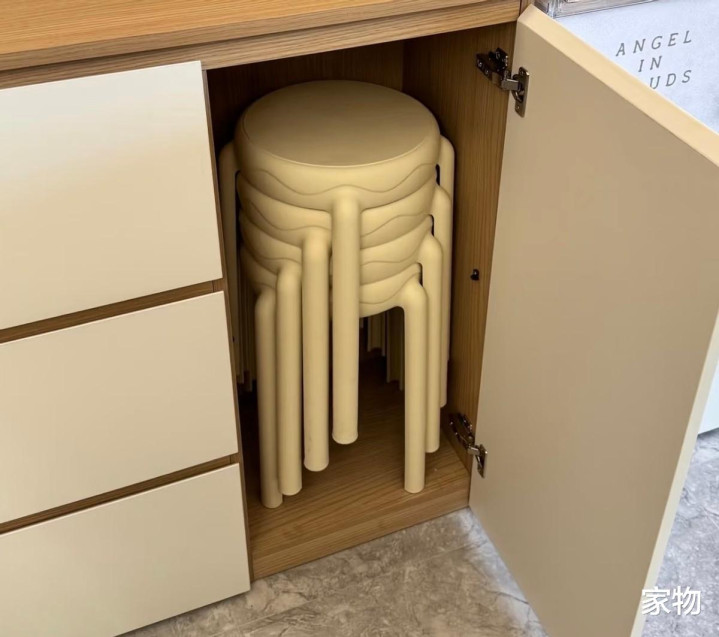 我个人是建议在餐边柜留出一个高柜空间,将这种可以堆叠收纳的椅子放进其中,一般来说可以轻松放上个四五把备用椅,又省地又整洁。