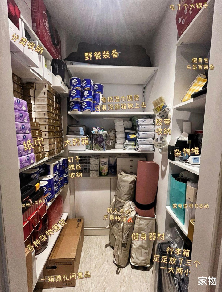 它存在的意义,就是统一归类收纳家中大小杂物,因为有房门,可以将它们统统隐入其中,面积也不用大,两平米就够,多做支架利用纵向空间。
