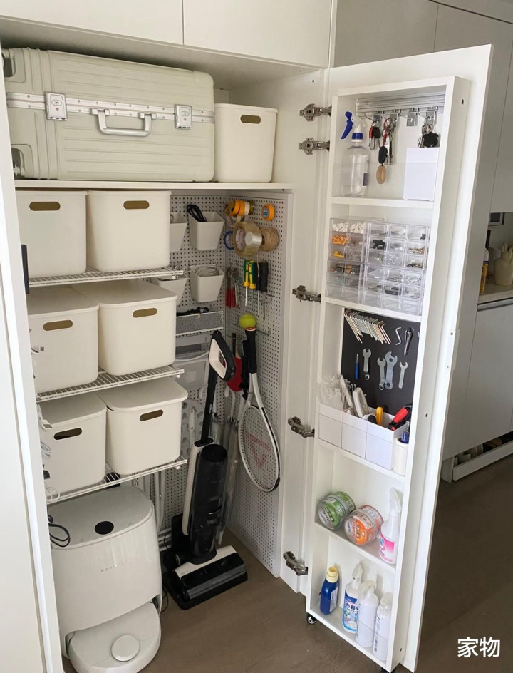 扫地机器人柜的PLUS版,自然就是五金家政柜了,它能进一步归类家中包括但不限于吸尘器、洗地机、 扫把等一系列清洁工具,和偶尔维修使用的五金用品,通常用收纳格+洞洞板+置物架的方式进行布置,以收纳各种各样的大小工具。