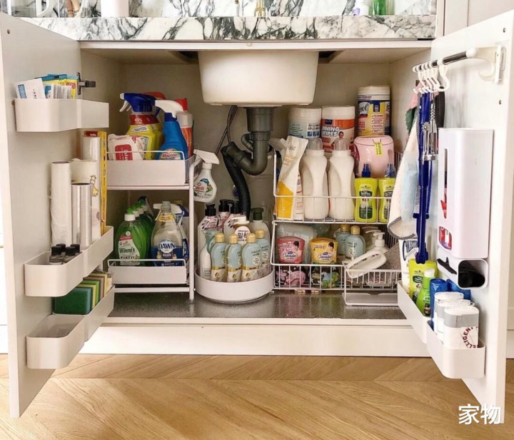 最后,水槽下方的收纳位我反而建议大家别做柜格,而是在入住后,根据个人生活习惯和使用需求,自行准备些收纳架、收纳篮或是壁挂盒,来放些厨房清洁或备用物品,要比做固定柜更灵活一些。