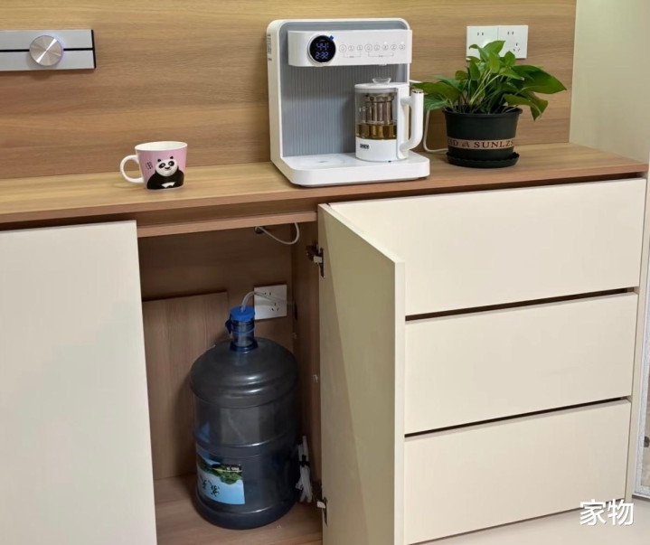 餐边柜确实是家里的核心柜子之一,不仅像我刚才说的,建议留出放餐椅的位置,更是建议留出一个放水桶的底柜位,以后无论是装那种台式茶吧机、管线机,还是用即热式饮水机,都会方便很多。