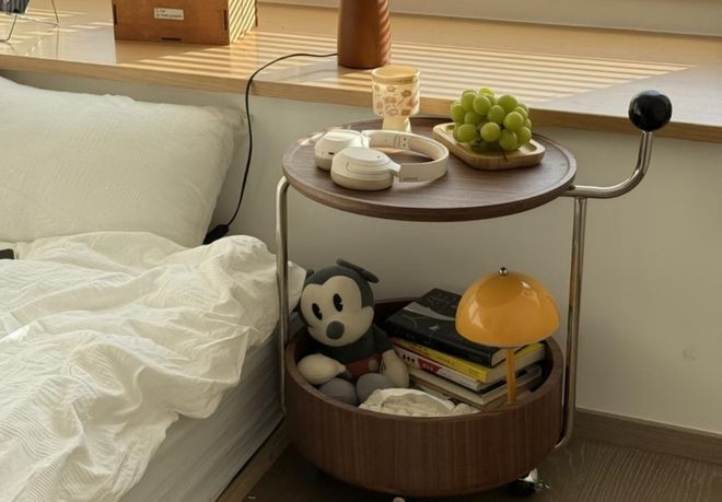 装修建议:不买传统床头柜,建议大家一侧可以选择带储物的边几,另外一侧可以用轻便的小推车或者隔板,形成不对称的美感。
